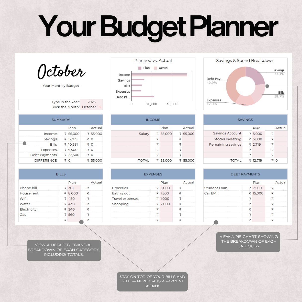 It’s a ready-to-use digital planner (Google Sheet) to track your income, expenses, bills, and savings — all in one place. Just download and start budgeting!